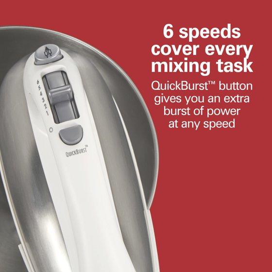 - 6 SPEEDS COVER EVERY MIXING TASK. Go from slowly folding ingredients all the way up to whipping at top speed. This hand mixer has 6 speeds to cover every mixing task and a Quick Burst button for an extra burst of power at any speed.