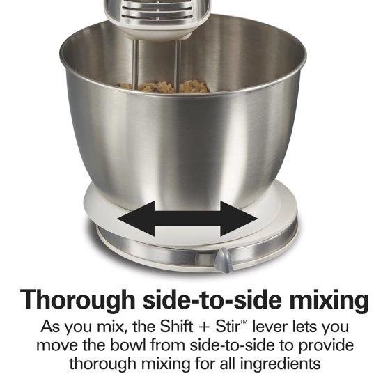 - BOWL MOVES SIDE-TO SIDE FOR THOROUGH MIXING. As you mix, the Shift Stir lever lets you move the bowl from side-to-side to provide thorough mixing for all your ingredients.