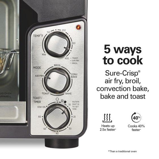 - 5 WAYS TO COOK: This versatile air fryer toaster oven replaces multiple appliances. It has five modes: Sure-Crisp air fry, broil, convection bake,, bake and toast. The toaster oven heats up 2.5x faster and cooks 40% faster than a traditional oven.