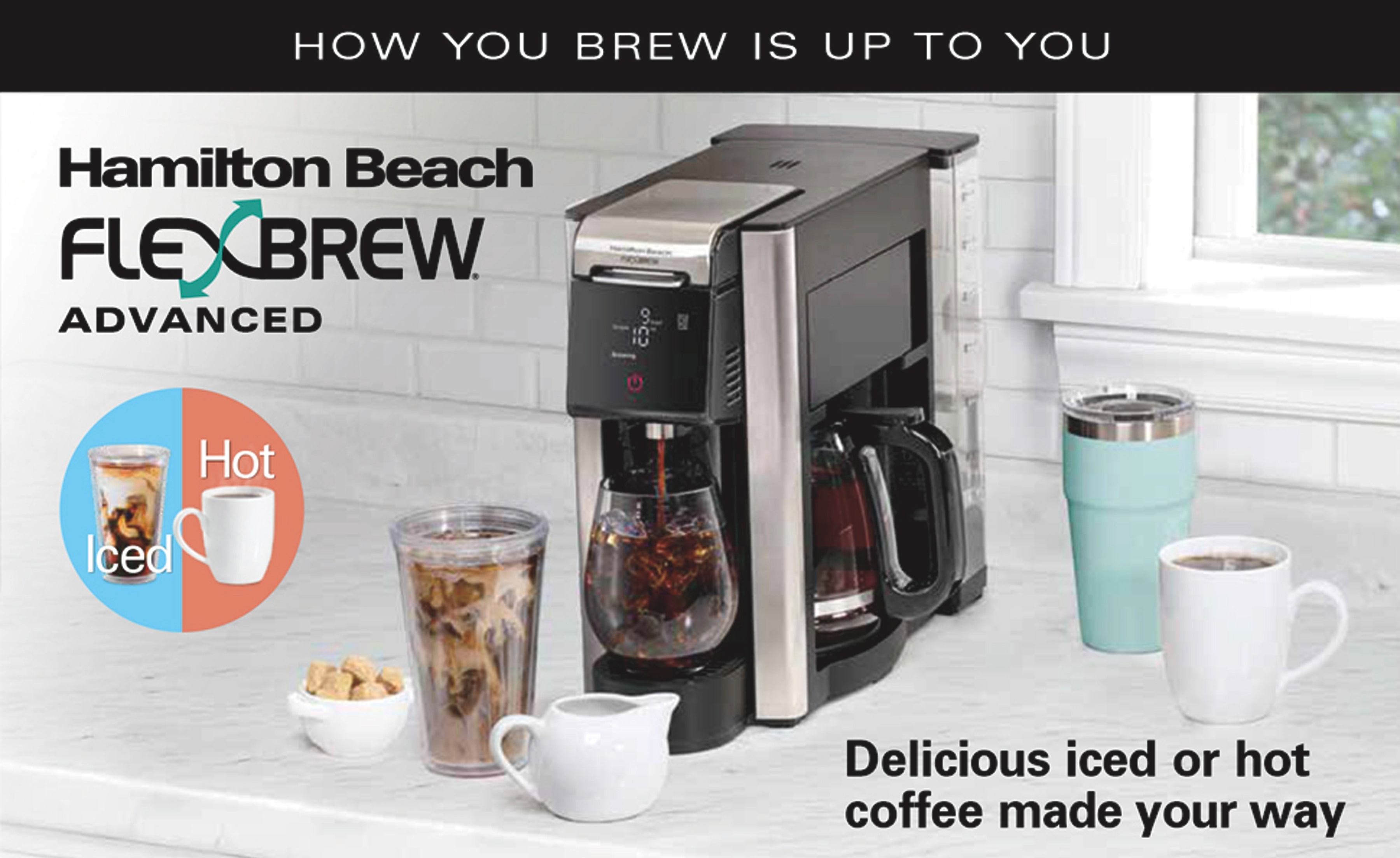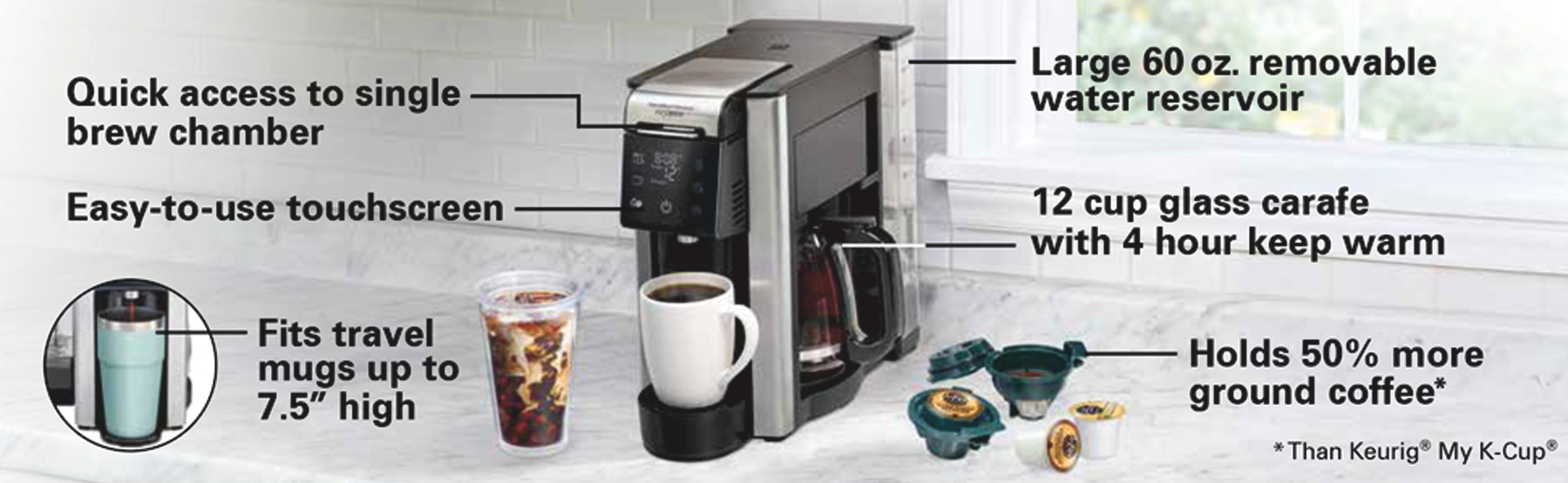 • Hamilton Beach FlexBrew 5-in-1 Coffee Maker, Single Serve, 12-Cup Coffee Pot, Hot & Iced, K Cup Pod Compatible or Grounds, Black