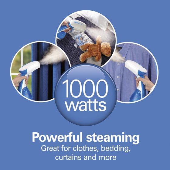 - POWERFUL STEAMING WITH 1,000 WATTS: This powerful handheld garment steamer is great for clothes, bedding, curtains and more. It quickly relaxes wrinkles and refreshes fabrics.