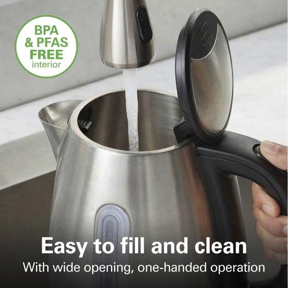 - WIDE OPENING FOR EASY CLEANING: This electric tea kettle's wide opening makes filling and cleaning easy. The stainless steel, BPA-free interior provides durability and peace of mind.