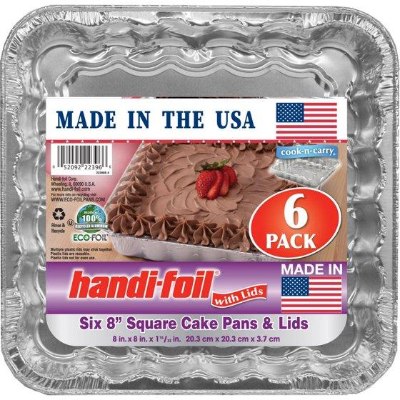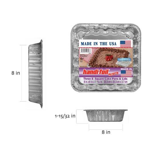 - Handi-Foil 8-inch Square Aluminum Cake Pans and Lids include 6 pans and 6 Snap-on lids per package.