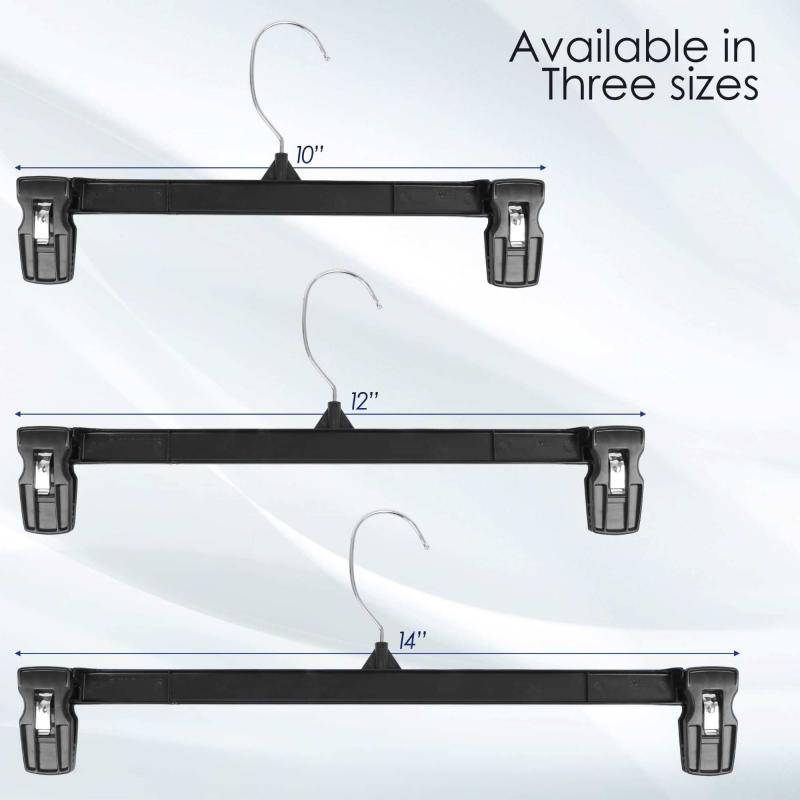 Finally, there is an easy and economical solution to your mis-matched hangers for both closets and retail displays. Our Heavy-Duty Recycled plastic hangers are break resistant and durable, capable of handling your heavy pants and wet clothes with ease. Use them in your closet, and keep an extra set in your laundry room. Offered in an assortment of sizes and quantities from plus-sized to children's, your whole family can have hangers that fit their clothes perfectly. With a slim design and swivel hook they can keep you organized, making finding the perfect outfit a breeze. Use them to help eliminate clutter and bulk from every closet in your home from the bedroom to your hallway coat closet. Made from recycled material, these are an eco-friendly option and because they are built to last they can be reused for years to come. Our pants hangers are perfectly designed to securely hold all your bottoms, from jeans and slacks to your favorite skirt and dress pants. The pinch clasps will ensure your clothes stay wrinkle-free and off the floor. These hangers are 12" wide and come in a pack of 10. They are sized to accommodate both men's and women's clothing.