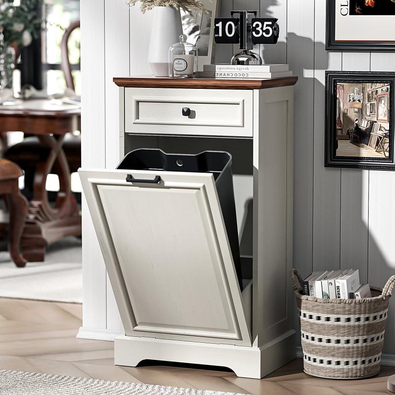 - Modern Trash Cabinet: Tilt-out trash cabinet is simple and practical. It can be easily incorporated into a variety of decorating styles. It will be perfect for dressing up your kitchen, home, apartment, dorm room, etc. It also can be used as a kitchen island or suitable to store dog food, cat food, etc.