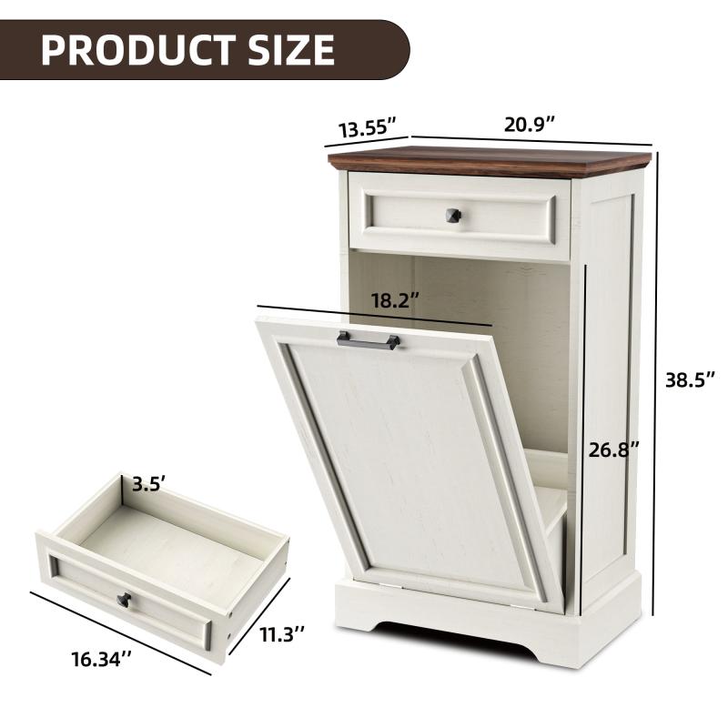 - High Quality: 20.9"L x 13.55" W x 38.5"H trash can cabinet (trash can not included). Made of MDF, the tilt-out trash cabinet fits up to 13 gallons of trash can. The top can be used to place decorations, daily supplies, and so on. You can put a microwave, coffee maker or anything you want on it.