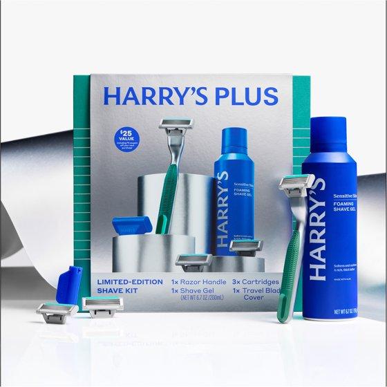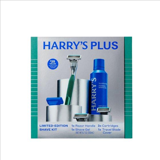 Harry's Plus Holiday Gift Set with Shaving Razor for Men, 3 Blade Refill Cartridges, and Shave Gel