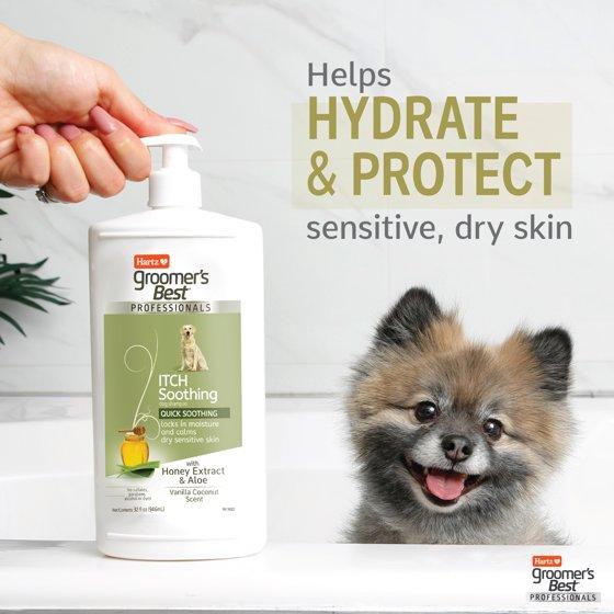 Does your dog need help ditching the itch? Wishing there was a quality, professional-grade dog shampoo to use at home? Now available, Hartz Groomer's Best Professionals Itch Soothing Dog Shampoo. This itch soothing dog shampoo hydrates dry, sensitive skin, while locking in moisture to calm the skin. The gentle formula includes aloe and honey extract helps soothe and protect your pups sensitive skin, while the Vanilla Coconut scent keeps him smelling fresh. With no added sulfates, parabens, alcohol or dyes, this premium dog shampoo meticulously cleanses your dog's coat, leaving your furry friend soft, clean and shiny. This full of suds scented solution is fitting for dogs of all ages and fur lengths. With Groomer's Best Professionals Itch Soothing Dog Shampoo, you get the professional pet salon experience from the comfort of your own home.
