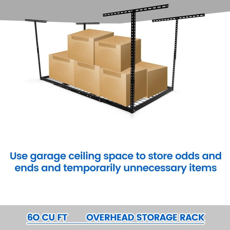 - Widely Used: Our ceiling garage organization shelf make it easy to hold bikes, heavy tools, household items, etc. Just adjust the height of the shelves to meet your different needs.