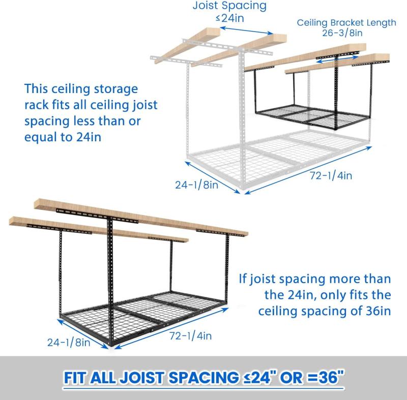 - This overhead storage rack fits all ceiling joist spacing ≤ 24", if joist spacing > 24", only fits the ceiling spacing of 36".