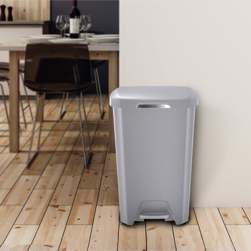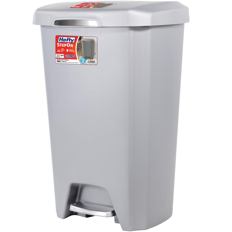 - Hefty Kitchen Trash Can, 12.1 Gallon Plastic Step Garbage Bin with Soft Close Foot Pedal Lid, Gray