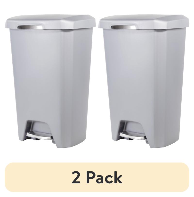 (2 pack) Hefty Kitchen Trash Can, 12.1 Gallon Plastic Step Garbage Bin with Soft Close Foot Pedal Lid, Gray