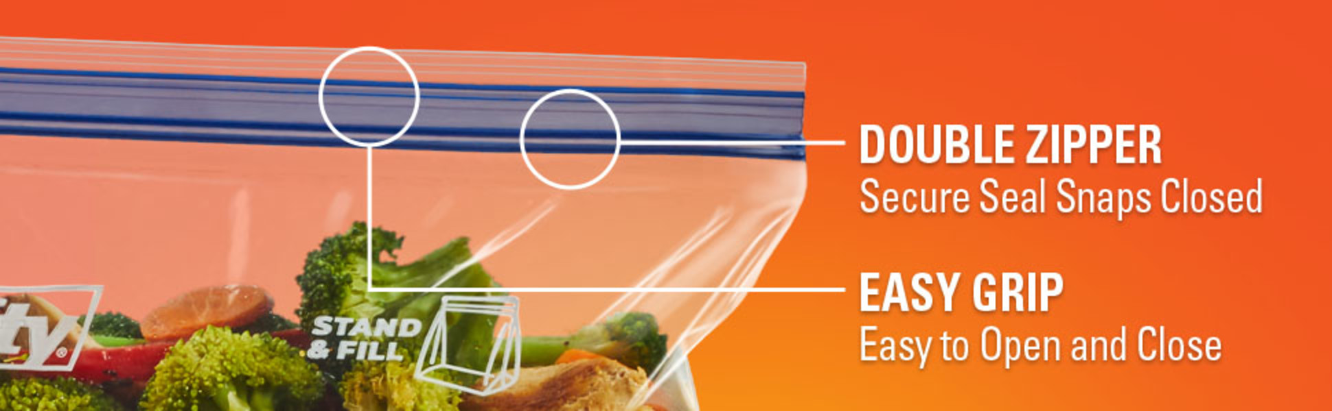 - Double Zipper—Simply press the two zippers together and, when you hear the snap, you’ll know these gallon freezer bags have a secure seal