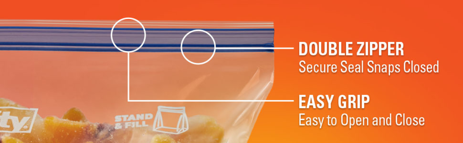 - Double Zipper—Simply press the two zippers together and, when you hear the snap, you’ll know these half gallon freezer bags have a secure seal