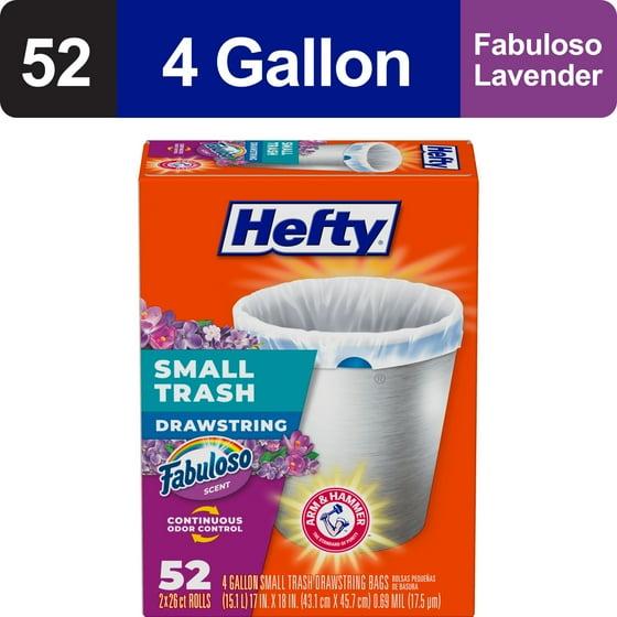 - 4 Gallon Garbage Bags—This package contains 52 Hefty Small white, Fabuloso* scented, 4 gallon trash bags