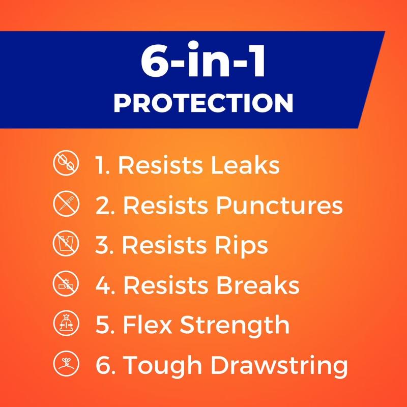 Trust Hefty Ultra Strong 33-Gallon Drawstring Trash Bags to keep your waste contained—all the way from can to curb. 6-in-1 protection provides flex strength, secure-fit closure, odor control, and resists leaks, punctures and rips. That stretchy strength means you don't have to worry about unexpected bag breakage and inconvenient messes. Don’t be afraid to use these large black trash bags for tougher jobs, such as lining your trash can or collecting trash from throughout the house. They’re made with heavy duty 1.05 mil thickness and expandable strength, so they can handle your heavier and messier cleanup projects. A break-resistant grip drawstring makes it easy to close the bag and cart it away without incident.