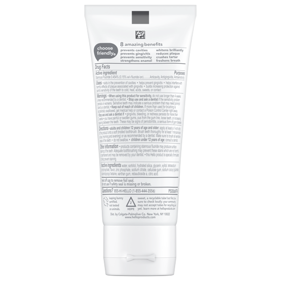 - This hello toothpaste with fluoride crushes cavities, tartar, plaque, gingivitis, tooth sensitivity, bad breath, strengthens enamel, and whitens teeth