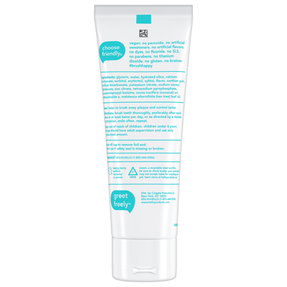- Includes one (1) 4.7 oz tube of hello Antiplaque and Whitening Toothpaste, Fluoride Free Toothpaste