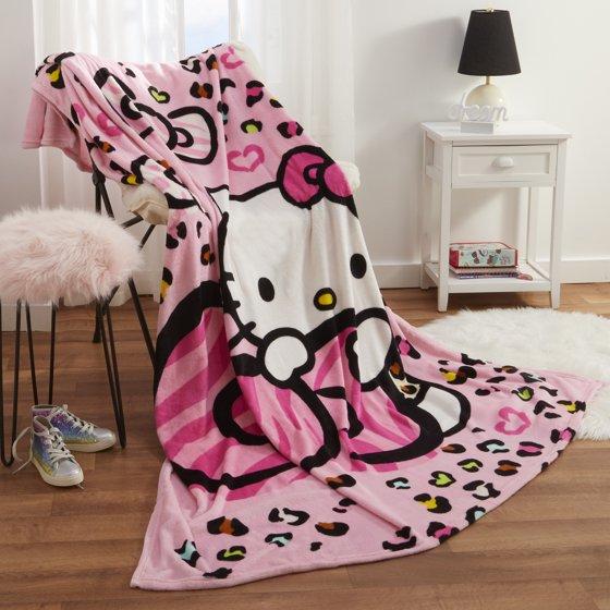 Hello Kitty takes center stage on this plush blanket. This charming Hello Kitty blanket is adorned with the beloved character's image, accented by her signature bow and surrounded by a playful array of bows and hearts in a whimsical pattern. The pastel pink backdrop, sprinkled with leopard print hearts in a palette of vibrant colors, adds a touch of fun and fashionable flair, making it a delightful addition to any Hello Kitty enthusiast's collection or a cozy accent for snuggling up during story time. This plush blanket is crafted with high-quality polyester for a super soft feel. It is large enough to fit a standard twin or full size bed and will keep you warm and cozy night after night. Fans are invited to wrap themselves in the heartwarming embrace of this Hello Kitty blanket, a piece that perfectly captures the essence of the beloved character.