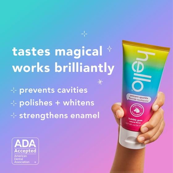 - WHAT I’M GETTING: Includes one (1) 4.2 oz tube of hello Unicorn Sparkle Kids Toothpaste with Fluoride, Bubble Gum Toothpaste for Kids