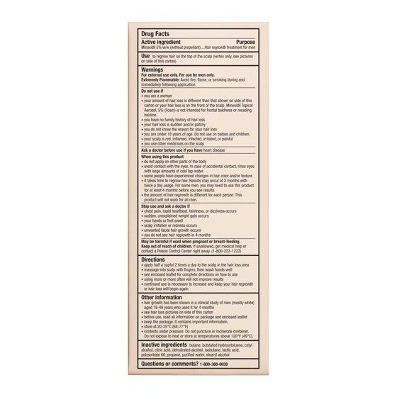 Minoxidil 5% (Without Propellant)Butane, Butylated Hydroxytoluene, Cetyl Alcohol, Citric Acid, Glycerin, Isobutane, Lactic Acid, Polysorbate 60, Propane, Purified Water, SD Alcohol 40-B, Stearyl Alcohol