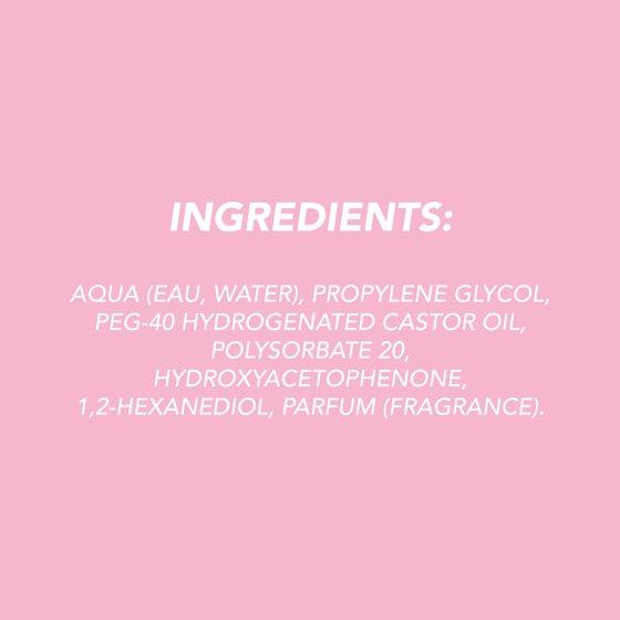 AQUA (EAU, WATER), PROPYLENE GLYCOL, PEG-40 HYDROGENATED CASTOR OIL, POLYSORBATE 20, HYDROXYACETOPHENONE, 1,2-HEXANEDIOL, PARFUM (FRAGRANCE).