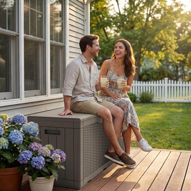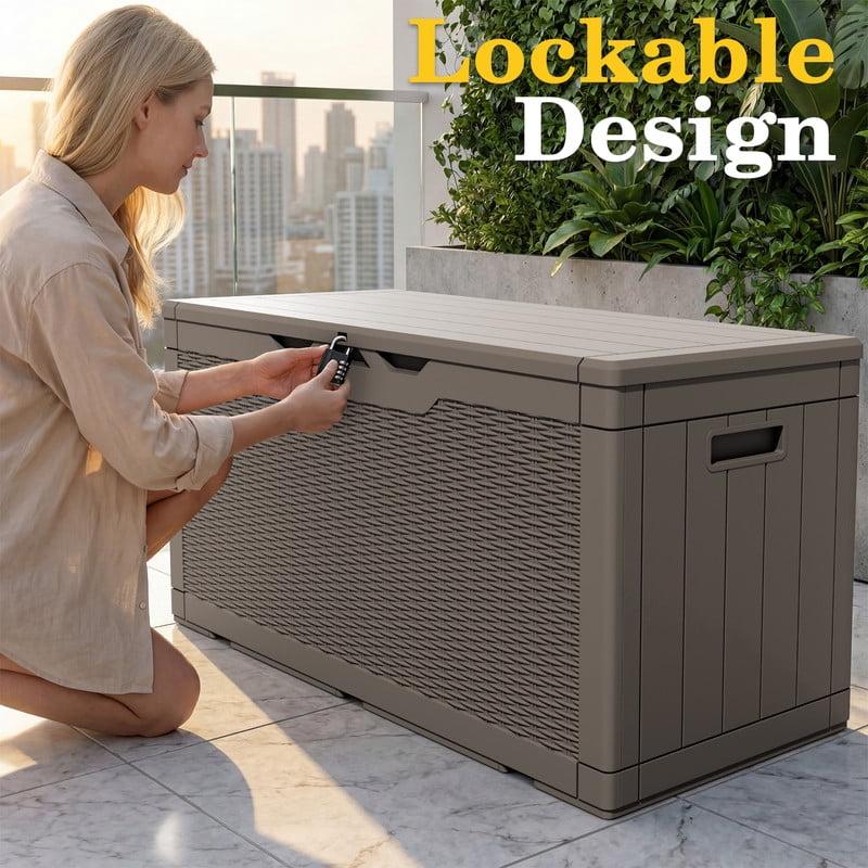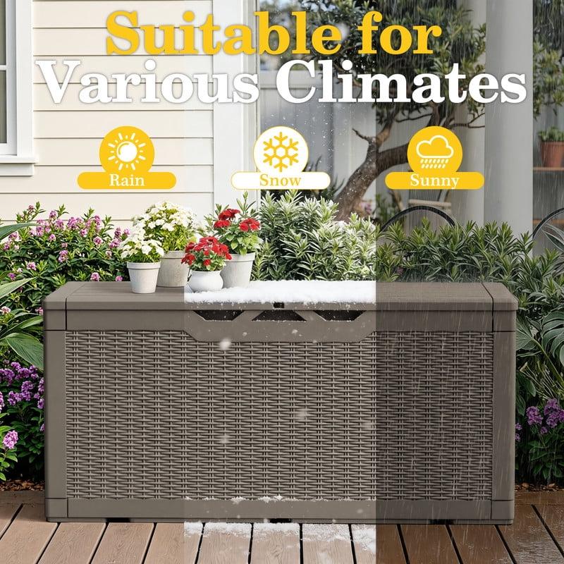 - Whether you need extra storage on your patio, in the garage, or even in the basement, this deck box is a versatile solution. Its neutral design complements any space, adding functionality without compromising style.