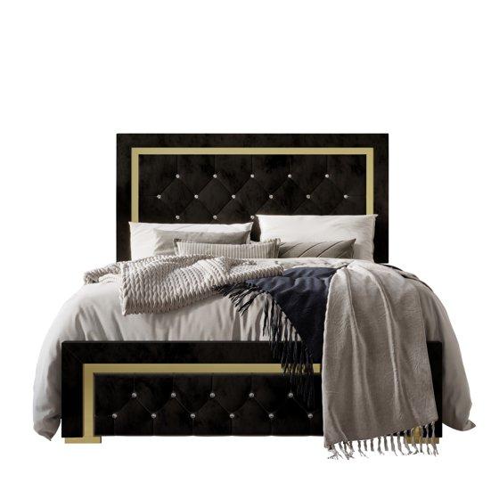 Home Design Deena Queen Upholstered Panel Bed Frame with Diamond Tufting and Gold Legs, Black, Easy Assembly