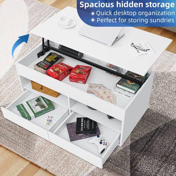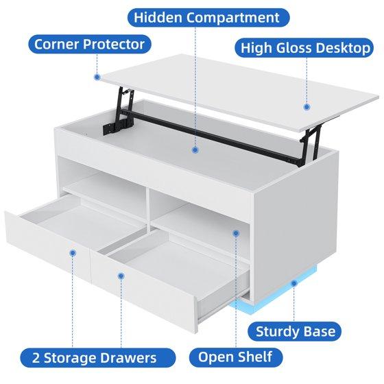 Hommpa Lift Top Coffee Table with LED Light 4 Tier Modern Center Tables with 2 Storage Drawers Hidden Compartment Open Shelves for Living Dining Room