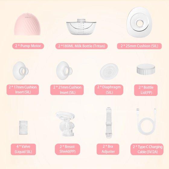 (1) 2 * Breast Pump Main Machine Pink (2) 2 * 25mm Shield Cushion (3) 2 * Flange Insert (21mm) (4) 2 * Flange Insert (17mm) (5) 2 * Diaphragm (6) 2 * Valve (7) 2 * Linker with Silicone Ring (8) 2 * 150ml Milk Bottle with Lid (9) 2 * Adjustable Bra Buckle (10) 2 * Extra Silicone Ring (11) 2 * Extra Valve (12) 2 * Type-C Cable (13) 1 * Manual (English)
