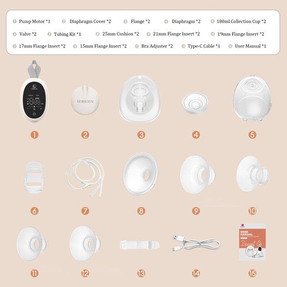 Contain: 1*Pump Motor、2*Diaphragm Cover、2*180ML Collection Cup、2*Diaphragm、2*Flange、2*Valve、2*25mm Cushion、2*21mm Flange Inse、2*19mm Flange Insert、2*17mm Flange Insert、2*15mm Flange Insert、2*Bra Adjuster、1*Type-C Cable、1*Flange Sizing Ruler、1*Tubing Kit (Spare part: Spare Silicone Valve *2)