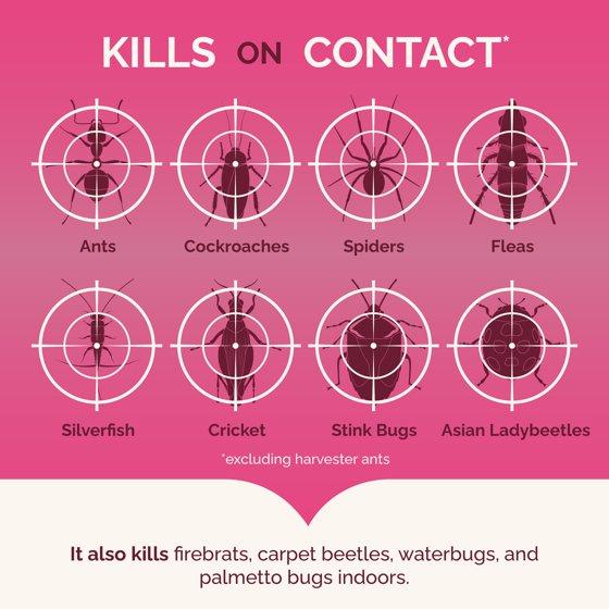 - KILLS INSECTS INDOORS AND OUTDOORS: Kills ants, cockroaches, spiders, fleas, crickets, Asian ladybeetles, palmetto bugs, stink bugs and other listed insects indoors and outdoors.