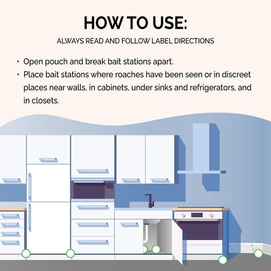 - USE INDOOR / HOME: Place bait stations wherever roaches are seen, near doors and windows, along baseboards, near pet food storage and inside cabinets and drawers