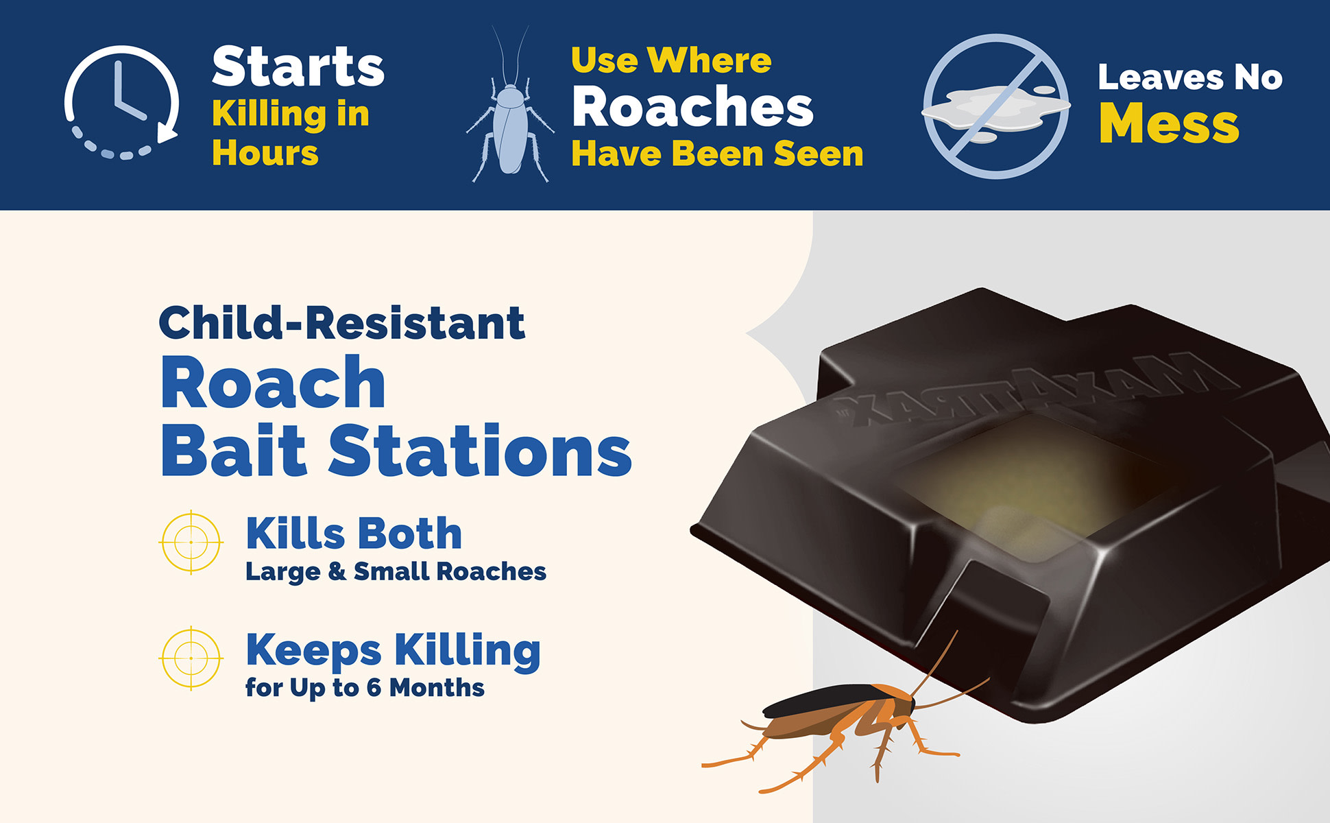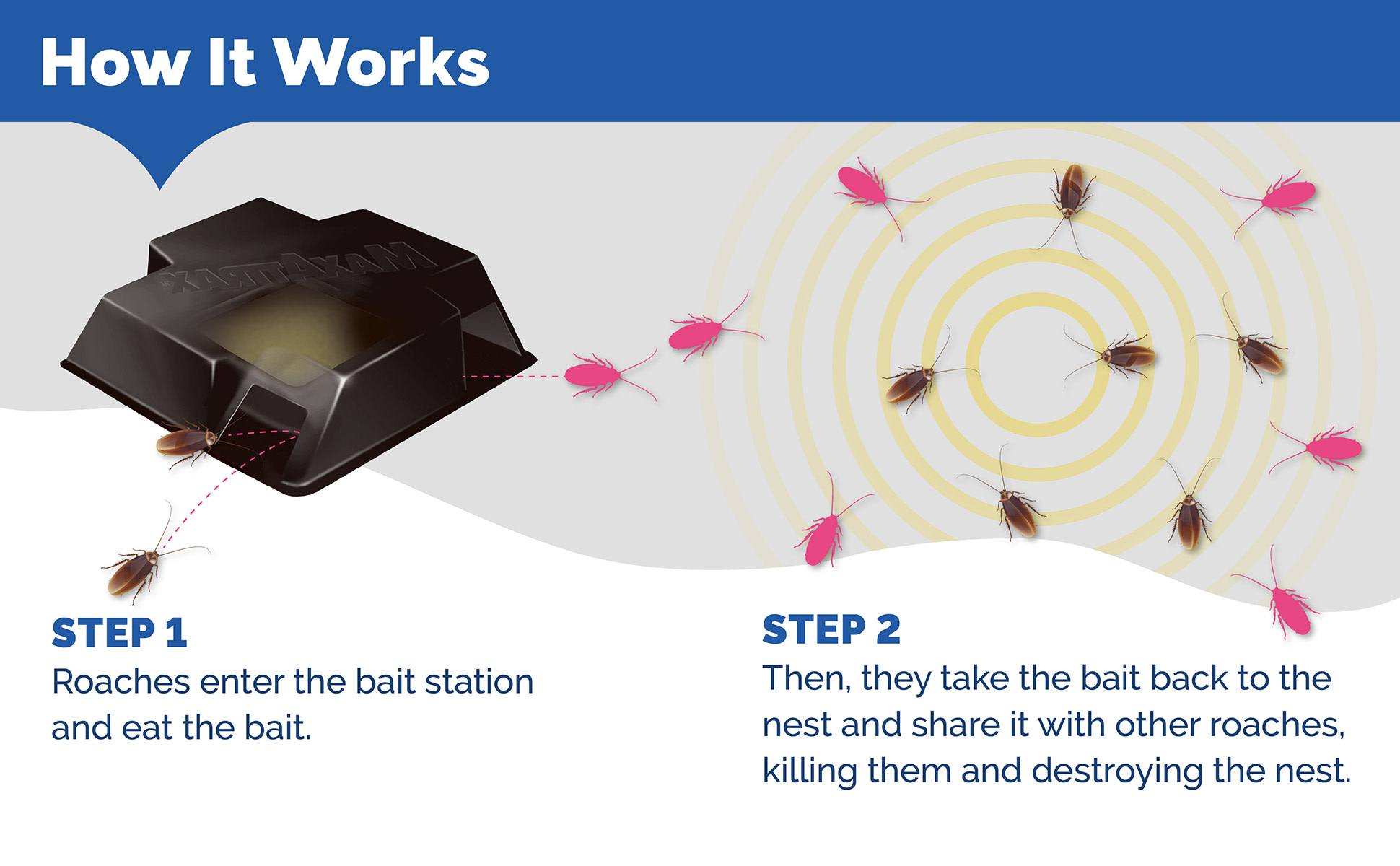 - CONTAINS ATTRACTANT: Draws roaches to the bait station, then they take the bait back to the nest where they share the bait and destroy the nest.