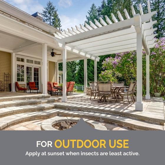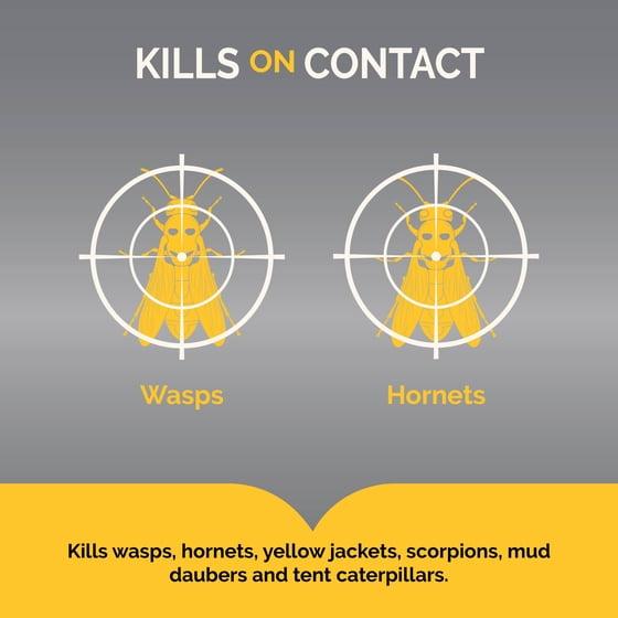 Shake well before using. Stop: Read entire label before use. Directions for Use. It is a violation of federal law to use this product in a manner inconsistent with its labeling. Never use indoors. Do not water the treated area to the point of runoff. Do not make applications during rain. All outdoor applications must be limited to spot or crack-and-crevice treatments only, except for the following permitted uses: 1. Treatment of soil or vegetation around structures. 2. Applications to lawns, turf and other vegetation. All outdoor applications to impervious surfaces such as sidewalks, driveways, patios, porches and structural surfaces (such as windows, doors and eaves) are limited to spot and crack and-crevice applications only. Application is prohibited directly into sewers or drains, or to any area like a gutter where drainage to sewers, storm drains, water bodies or aquatic habitat can occur. Do not allow the product to enter any drain during or after application. Wasps, Hornets & Yellow Jackets. 1. Apply at sunset when insects are least active. 2. Stand a safe distance from the nest. Don't stand directly underneath. 3. Shake can well before each use. Aim spray away from person. Push button to spray. 4. Spray the nest until soaked. This product's powerful spray will also kill insects that return to the nest over the next few days. 5. Wait at least 24 hours before removing the nest. Use of this product on evergreen and holly is not recommended as damage may result. Other Pests. Tent Caterpillars: Apply in the late afternoon or evening when caterpillars have returned to their tents. Soak tents on all sides. Scorpions: Stand at a safe distance and use the power of the jet spray to reach and cover the scorpion. Ants: Spray trails, nest and point of entry. Spray on ants where possible. Use Tips. ? If it's windy, stand with the wind at your back to avoid spray drift. ? Do not use this product in or on electrical equipment due to the possibility of shock hazard.