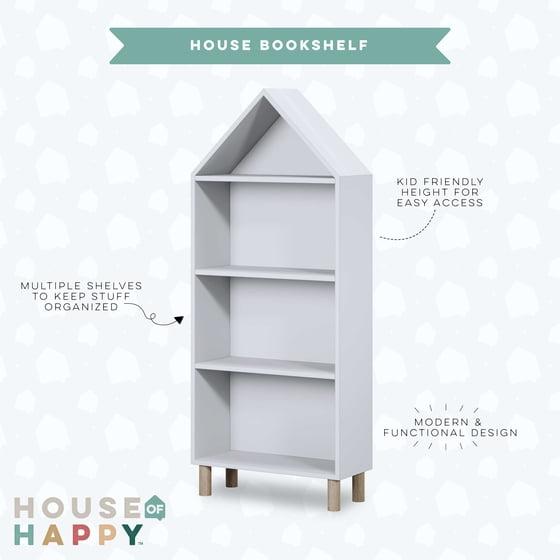 Organize your kids’ room or play room in style with our “House of Happy” House shaped Book Shelf. Crafted from high quality Manufactured Wood, this bookshelf offers storage and display options for books, toys, and many other items in your kid’s room. Modern but playful styling offer versatility in a smooth White finish that easily matches with a range of decor styles. Best of all, the included hardware makes self-assembly a breeze. Follow installation and capacity guidelines.