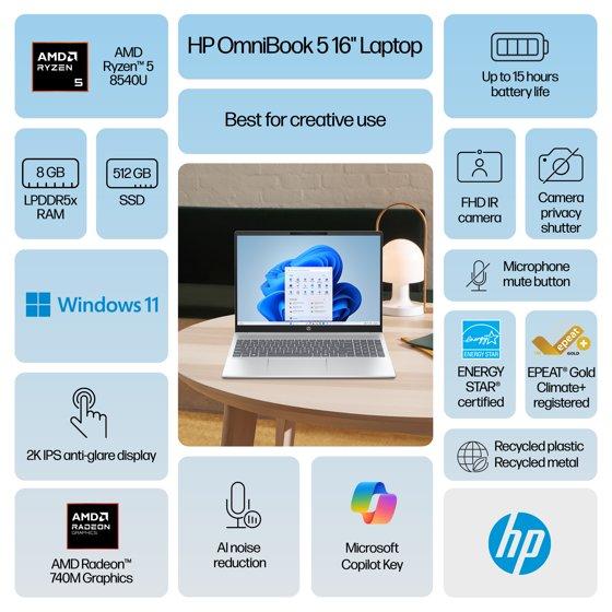 HP OmniBook 5 16 inch 2K IPS Laptop AMD Ryzen 5 8540U 8GB RAM 512GB PCIe 4.0 NVMe SSD Glacier Silver