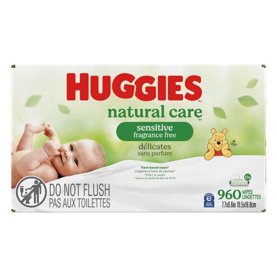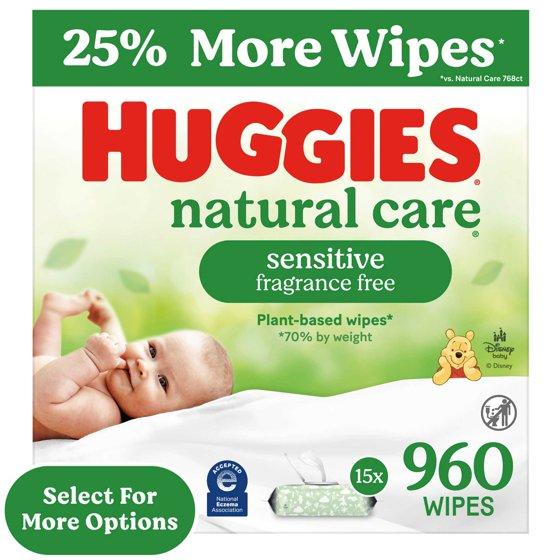 - Huggies Natural Care Sensitive Wipes: 15 flip-top packs of 64 unscented wipes (960 baby wipes total); the same baby wipes you love, now with a brand new look and fun designs!