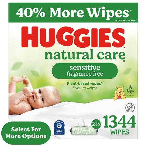 - Huggies Natural Care Sensitive Wipes: 24 packs of 56 unscented wipes (1344 baby wipes total)