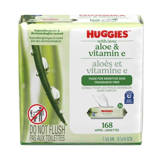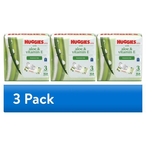 (3 pack) Huggies Wipes with Aloe & Vitamin E, Unscented, 3 Flip-Top Packs, 168 Total Count (Select for More)