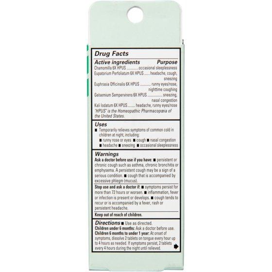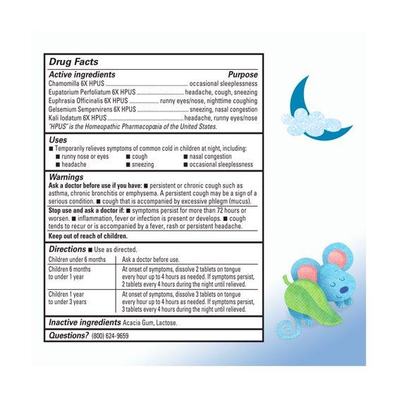 - EASY TO USE: Quick-dissolving tablets that melt in your baby's mouth instantly to relieve runny nose and eyes, nighttime cough, congestion, headache, sneezing and occasional sleeplessness due to common head colds in babies 6 months+