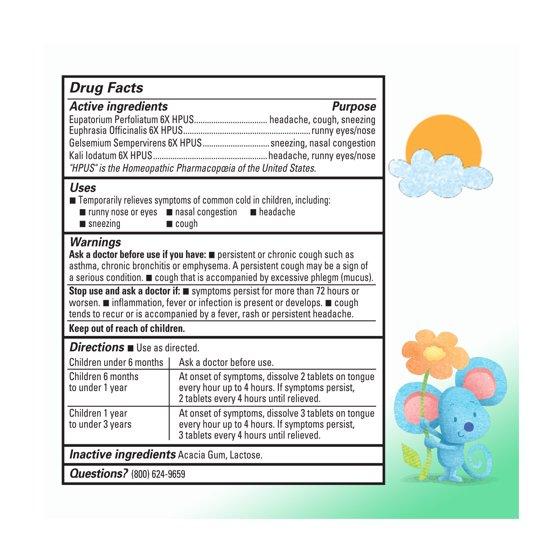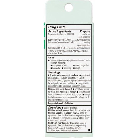 Active Ingredients: Eupatorium Perfoliatum 6X HPUS: headache, cough, sneezing, Euphrasia Officinalis 6X HPUS: runny eyes/nose, Gelsemium Sempervirens 6X HPUS: sneezing, nasal congeston, Kali Iodatum 6X HPUS: headache, runny eyes/nose. Inactive Ingredients: Acacia Gum, Lactose. "HPUS" is the Homeopathic Pharmacopoeia of the United States.