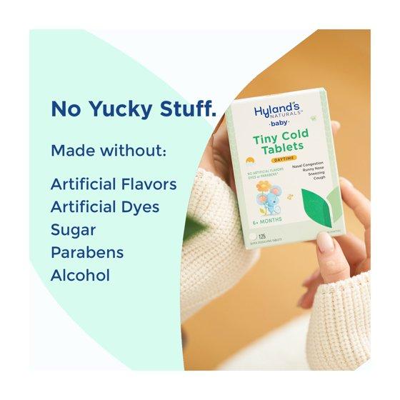 Hyland's Baby Tiny Cold Tablets Daytime.* Colds can rock your baby out of their comfort zone. These soothing tablets help ease their head-clogging symptoms with effective natural active ingredients, so they can get back to focusing on exploring the world around them. Easy to use quick-dissolving tablets provide relief of nasal congestion, runny noses, sneezing and coughs due to colds. Free of artificial flavors, dyes or parabens. Made with gentle, natural active ingredients to help ease sneezing and nasal congestion. At Hyland’s, kindness is our north star. Kindness to our bodies, hearts, and minds. That’s why our products are formulated in Good Manufacturing Practices certified facilities with high quality ingredients carefully selected around the world and third-party lab tested to ensure their safety and quality. For all those not-so-feel-good moments, we’re here to help. *Claims based on traditional homeopathic practice, not accepted medical evidence. Not FDA evaluated. Includes (1) 125ct bottle of baby daytime tiny cold quick-dissolving tablets for infants 6 months and up.