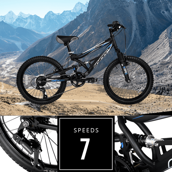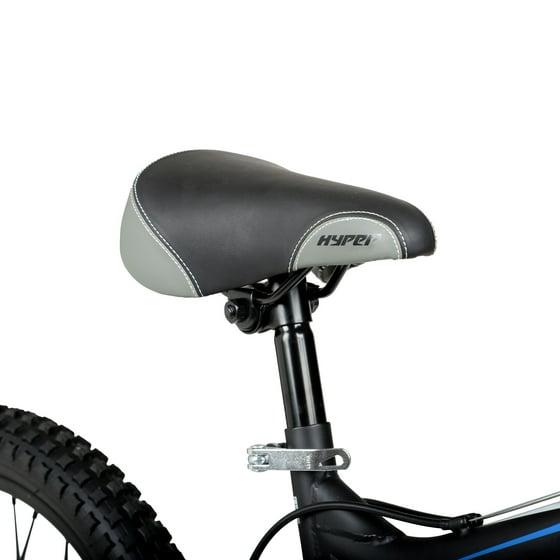 Ride off the pavement in the Hyper Bicycles 20"; Boys Shocker Mountain Bike in Black. This kids mountain bike features a steel frame that lets users ride harder for longer. The Shocker includes both rear suspension for a smooth ride on any surface and alloy rims with front and rear linear pull breaks for the ability to stop and go as you please. It features 7 speeds, ensuring versatility in the ride. The bike has comfortable twist shifters with a rear derailleur, allowing riders to change the gears quickly and smoothly. Designed with your comfort in mind, it features a deluxe padded seat, gripped handlebars, and resin platform pedals. This mountain bike has a sleek, black design with blue accents that provides a modern look. The bike can be ridden on a variety of surfaces, allowing for flexibility in where you go with it. Perfect for your off road adventure or weekend leisurely rides, the Hyper Shocker Mountain Bike will help make your rides more enjoyable.