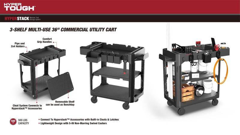 Hyper Tough Hyper Stack 3-Shelf Multi-Use 36" Commercial Utility Cart, 500 lb Capacity, Black