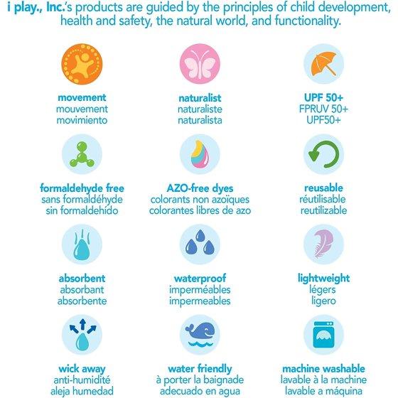 i play.® is the original reusable Swim Diaper manufacturer and has a patented three-layer design. The wicking liner helps prevent diaper rash, the inner absorbent layer helps protect against messes outside the pool, and the waterproof outer layer works with the snug-fitting waist and legs to provide secure protection from unsanitary and embarrassing accidents in the pool.