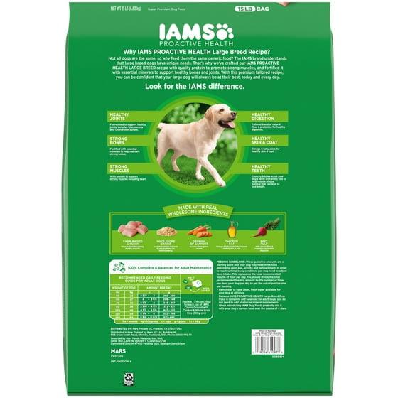 - 15 lb. Bag: Contains one (1) 15 lb. bag of Iams Proactive Health Adult Large Breed with Real Chicken Dry Dog Food