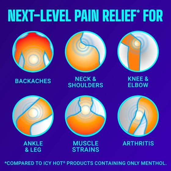- POWERFUL RELIEF: Targeted muscle and joint pain relief for backaches; lower back, neck, shoulder, knee, elbow, ankle and leg pain; pain from strains, sprains and bruises; and arthritis pain