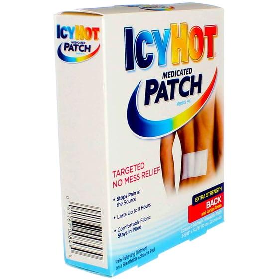- STOPS PAIN AT THE SOURCE: Icy Hot pain relief patches help temporarily relieve minor pains associated with back pain, muscle pain, arthritis pain, sprains, bruises & muscle cramps.