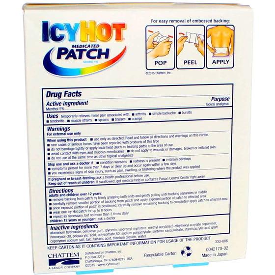 - NO MESS: Icy Hot Medicated Patches are mess-free, easy to apply and comfortably stay in place for hours.